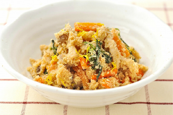 凍り豆腐や油あげは生豆腐から作られますが、丸大豆からたんぱく質を分離、抽出する時に副産物として「生おから」が産出されます。生おからには大豆の不溶性食物繊維が豊富に含まれています。生おからは水分が多く、そのままでは流通が難しいため、当社では製造工程から産出される生おからのほぼ全量を乾燥しています。乾燥する事により保存性と利便性を向上させています。