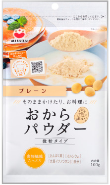 「食品用乾燥おから」は粒度の粗い物から微粉末状まで用途に応じて取り揃えています。市販用商品の「おからパウダー」のクッキングタイプは卯の花等の各種おから料理に、パウダータイプはそのまま牛乳やヨーグルトに混ぜたり、ケーキ作りの材料としてもお使いいただけます。業務用は紙袋、フレコンなどの形態があり、米菓やクッキー、ケーキの補助材料など、お客様の用途に応じて使用していただくことができます。