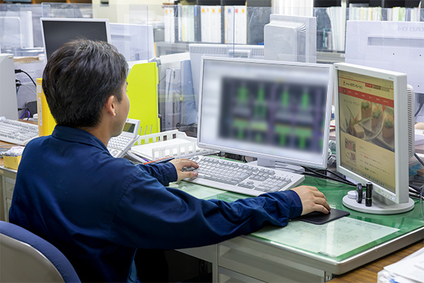食品を製造する設備を導入するためには、製品の設計段階から製造方法と製造設備を同時に開発しなければなりません。現在、当社では専門スタッフとして機械と電気設計の専門技術者を擁し、設備の設計にもCAD等を導入していますので、開発から設備化までのリードタイムを短縮する事ができます。一方、製造設備は日常の保全と故障した際には修理が必要となりますが、社内に保全・修理部門を有しているため、設備が故障した場合でも短時間での復旧が可能な体制を整えています。