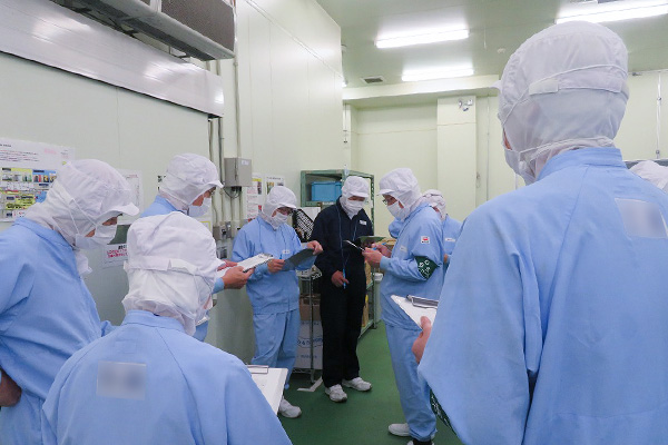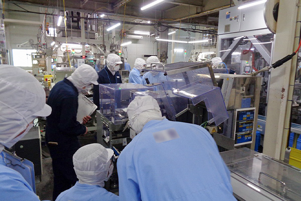 工場部門だけでなく間接部門も含めた全部門で活発な活動を続けています。各サークルが商品の品質向上やロス削減・エネルギーコスト削減など、幅広い内容をテーマとして設定して改善に取り組み、改善活動の成果は各職場にて発表して情報共有と水平展開につなげます。