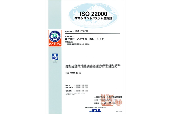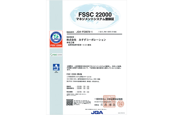 グローバルな事業展開をするために、国際規格認証として食品安全マネジメントシステム(ISO22000/FSSC22000)を取得し、維持する事により「食品を安全に生産するための仕組み」の構築と継続的な改善を行っています。