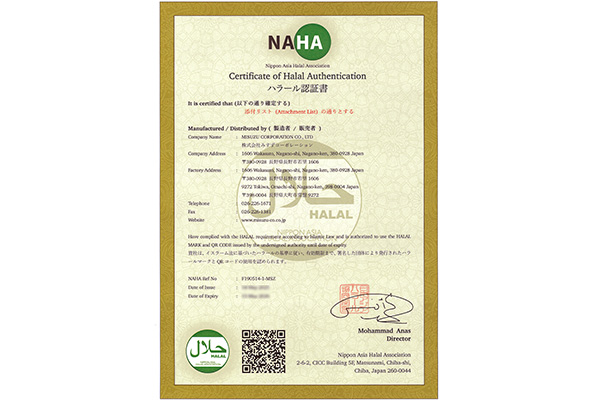 ハラール認証はイスラム教の教えに基づいて製品やサービスがハラル(許されている)かどうかを確認する制度です。ハラール認証を取得することでムスリムの方々が安心して利用できる製品やサービスを提供する事が可能となり、国際市場にも対応する事ができます。当社ではハラール認証を遵守するために、原材料の確認、従業員の教育、工程の管理体制等を整備しております。対象商品の凍り豆腐、油あげ、油あげきざみ、味付けいなりあげの一部の商品でハラール認証を取得しております。