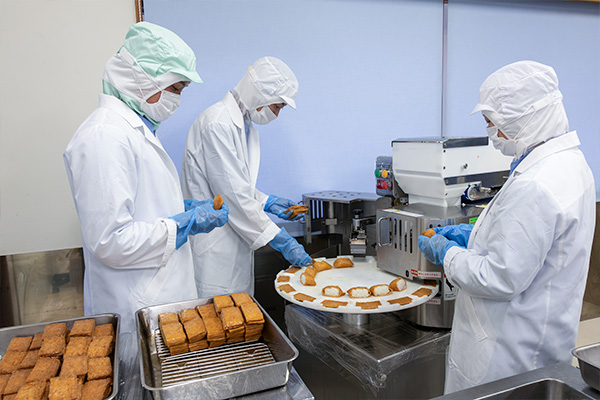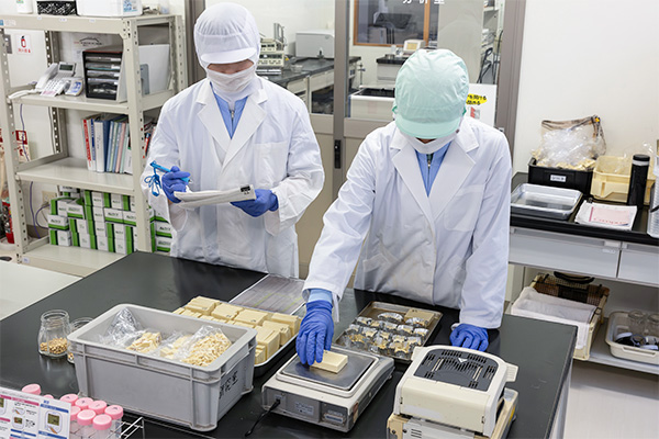 商品の品質面においては、工場内の工程における異物混入防止対策として各生産ライン上に金属検出機、X線異物検査機、重量チェッカーなど専用の検査機器を設置しています。そして、定期的な抜き取り検査と細菌検査を行うとともに、生産ラインごとに日々のサンプルを保管することによって商品の品質を保証する体制を整えています。そのため出荷済の商品に異常等が発生した場合でも、製造工程を速やかにトレースする事ができるようになっています。商品群固有の検査内容として、凍り豆腐商品では湯戻し試験(軟らかく戻るかどうか保水性の検査)や味付けいなりあげでは寿司ロボットを使用した適正試験(破れ試験)などを行ない、各分析結果や品質傾向を出荷前に把握し、工場部門とも情報を共有して日々品質の向上に努めています。