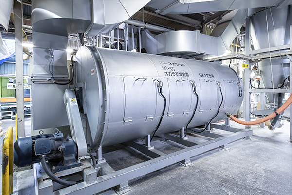 「生おから」を乾燥する方法は、熱風乾燥方式を採用しています。豆乳製造プラントで発生した「生おから」は乾燥機に搬送されて、乾燥機の内部では「生おから」を攪拌しながら熱風を当てて水分を取り除きます。乾燥が進むと比重が軽くなるので、内部の気流によって重量選別されながら乾燥胴内を移動して、出口部で搬送空気と乾燥おからに分離されます。