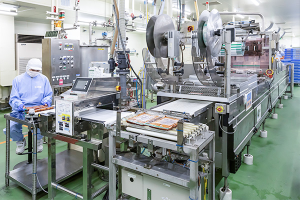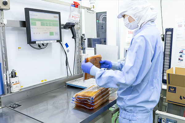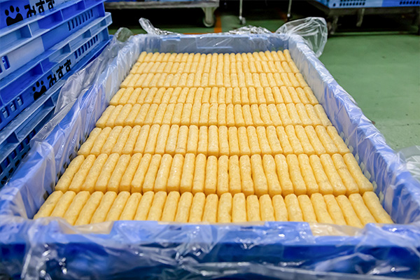原料の油あげはご飯が詰められるように工程の途中で内部の豆腐質を剥離処理します。味付けの最初の工程で、原料用油あげに含まれている余剰な油分を取り除きます。油抜きした油あげは中央で半分に切断して包装機に供給し、スープを注入して密封します。パックは味付けいなりあげの四隅がつぶれないように底部が容器状になっています。レトルト殺菌釜で調理と殺菌を行ない、各商品専用の外装フィルムで包装して出荷します。商品は各地域で好まれる大きさと味付け、内容量を各種取り揃えています。