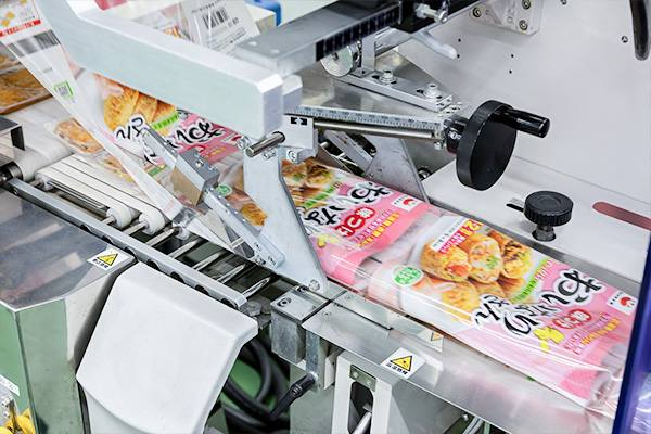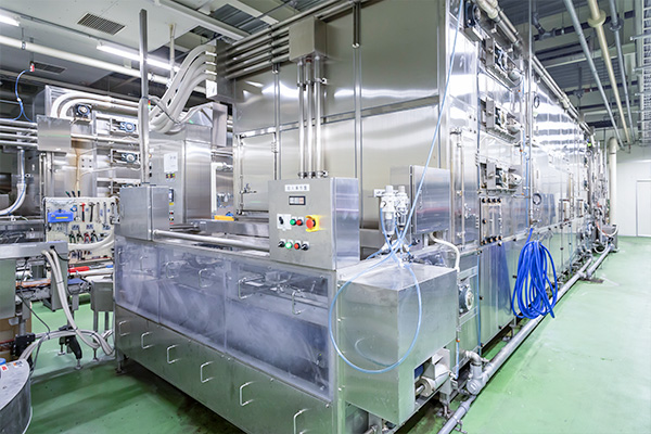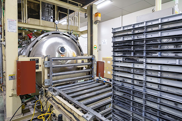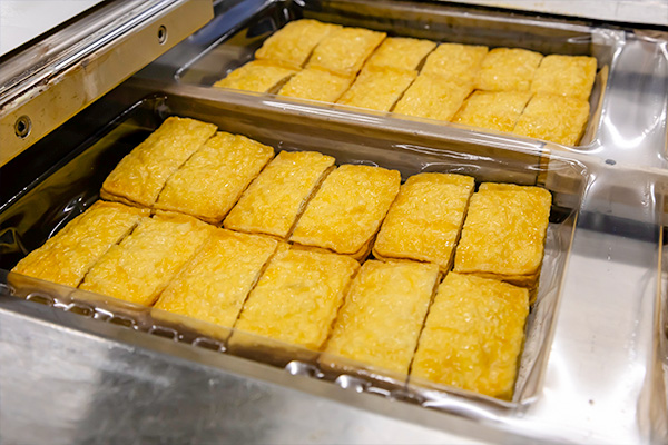業務用商品の原料油あげも工程の途中でご飯が詰められるように内部の豆腐質を剥離処理してあり、ご飯を詰める時の開きも良くなっています。最初に原料用油あげに含まれている余剰な油分を取り除きます。油あげの中央部で半分に切断、大パックの入り数単位で集積します。大パック用の包装機で容器の形に成形しながら油あげを供給、スープを注入して密封します。スチーマーで調理と殺菌した後、短時間で冷却します。冷却後はお客様専用のダンボール箱に梱包し、冷蔵庫で内部まで完全に冷却してから要冷蔵商品として出荷します。業務用商品はプロの味と新鮮さ、品質、寿司ロボットへの適性、歩留まりなどが重視されますので、パックはいなりあげの四隅がつぶれず、取り出し時の作業性を良くするため、底部が容器形状に成形された深絞りタイプを採用しています。調理殺菌は、出来立ての味をそのままお届けでき、お客様の冷蔵庫でも短期間の保存ができるチルド方式を採用しています。