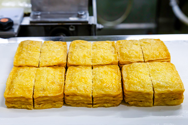 家庭でいなり寿司用油あげを作る時には、油あげ表面の油っぽさを取り除くために、事前にお湯で煮て余分な油分を取り除いてから味付けをします。当社では、いなり寿司をおいしく召し上がっていただくために、この油抜き処理は必要な前処理と位置付けて、長年の経験と研究結果に基づいて専用の油抜き装置を自社開発しました。油抜きをすることで、油あげにスープがし染み込みやすくなると共にジューシー感が際立ち、いなり寿司を食べた時の口当たりもすっきりとします。当社独自の油抜き処理工程は家庭用、業務用の各製造ラインに組み込まれています。