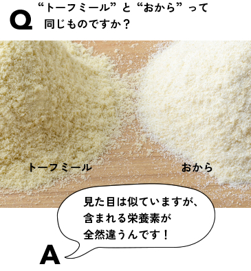 たびたびお客さまから「おからと粉とうふ(トーフミール)は同じものですか?」というお問い合わせをいただくことがあります。同じようにみえますが、「おから」は豆腐を作るときに大豆から豆乳をしぼったあとに残った繊維質で食物繊維が豊富です。「粉とうふ(トーフミール)」は凍り豆腐を粉末状にしたもので、植物性たんぱく質はミネラルが豊富です。どちらも身体によい食材ですので、用途や目的に合わせた使い分けをおすすめします。