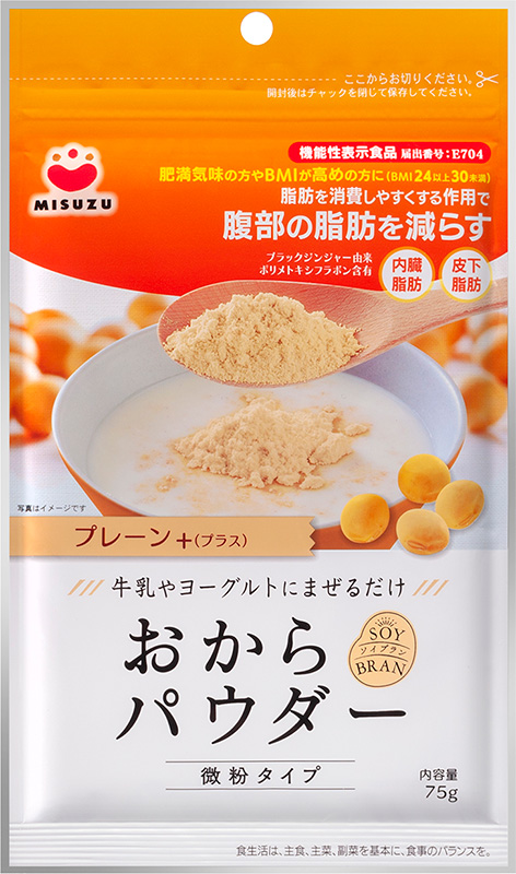 ブラックジンジャー由来ポリメトキシフラボンを配合した、機能性表示食品の「おからパウダー」です。ブラックジンジャー由来ポリメトキシフラボンは、「日常活動時のエネルギー代謝において、脂肪を消費しやすくする作用により、BMIが高め(BMI24以上30未満)の方の腹部の脂肪(内臓脂肪及び皮下脂肪)を減らす機能」があることが報告されています。乾燥おからをさらに微粉砕したプレーンタイプですので、そのまま牛乳やヨーグルトに混ぜて召し上がれます。