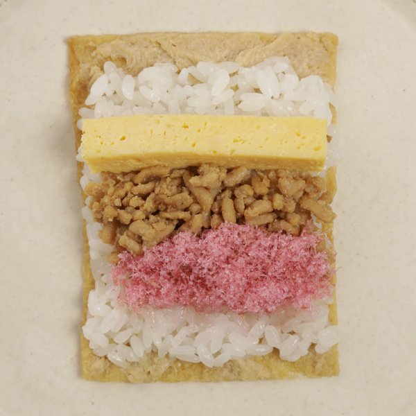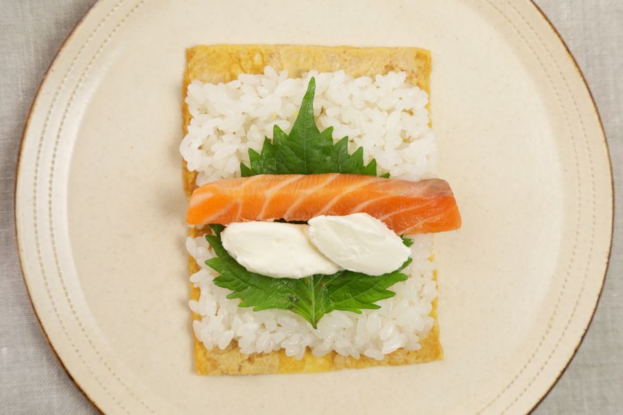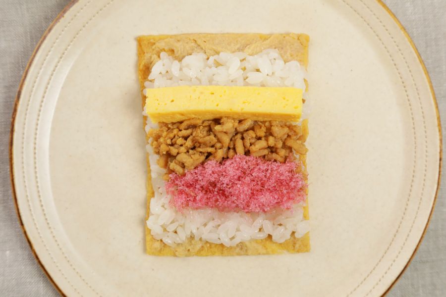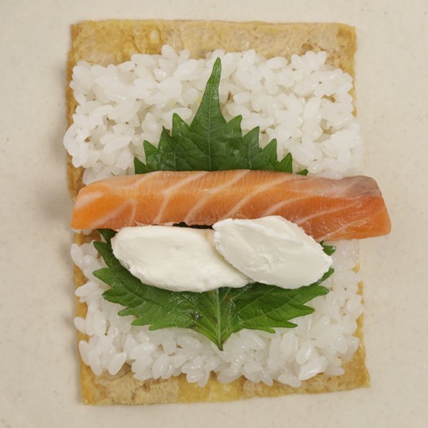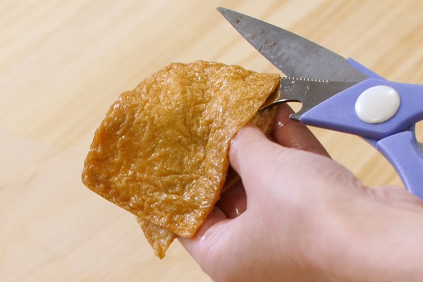 巻きあがった手巻きいなりを半分に切る時は、ラップごと切ると崩れるのを防げます。