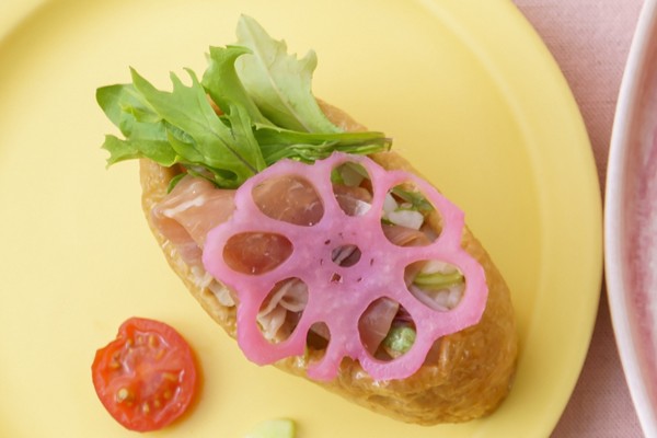 3. <生ハムと花れんこんの飾りいなり>れんこんをスライスしたら、軽く下茹でし、梅酢に漬けて色づけします。②の上に、ベビーリーフ、生ハム、花れんこんをきれいに飾り付けたら、生ハムと花れんこんの飾りいなりの出来上がりです。