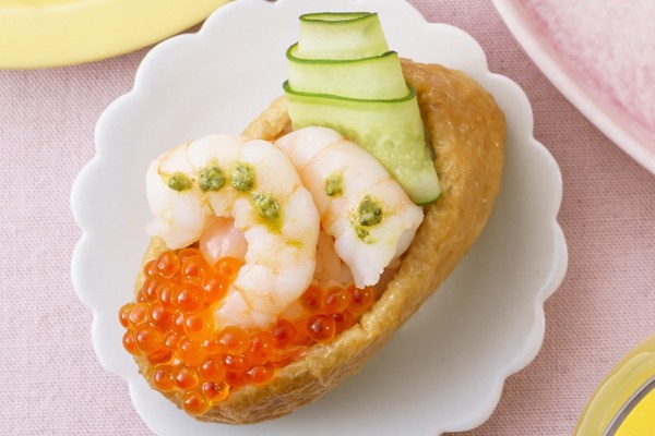 れんこんのシャキシャキとした食感と生ハムの塩味が効いた飾りいなりと、海老といくらをたっぷり使った贅沢な飾りいなりです。ひな祭りのお祝いにぴったり!