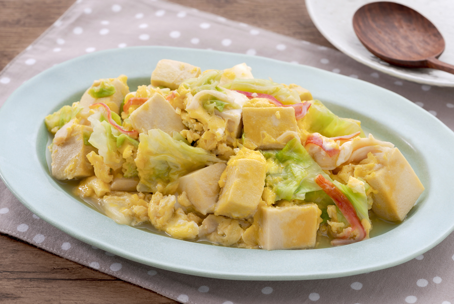 全形(レギュラーサイズ)・ひとくち・細ぎり・キューブなど用途に応じたいろいろなサイズの凍り豆腐や調味料が添付されている凍り豆腐を使った、手軽でおいしいレシピをご紹介します。