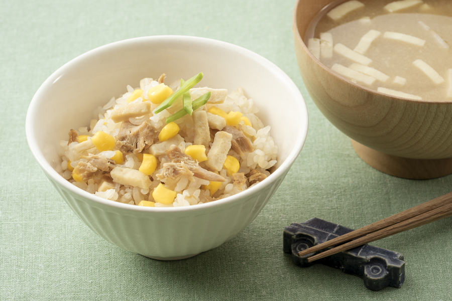ツナとコーンと細ぎりこうや豆腐の炊き込みご飯