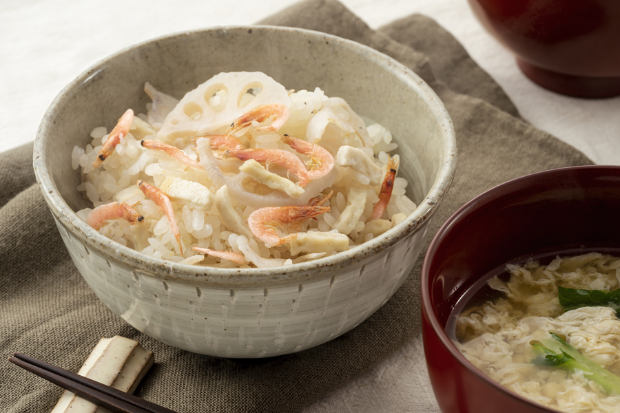 桜エビとれんこんと細ぎりこうや豆腐の炊き込みご飯