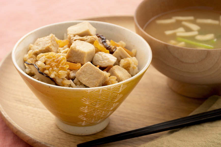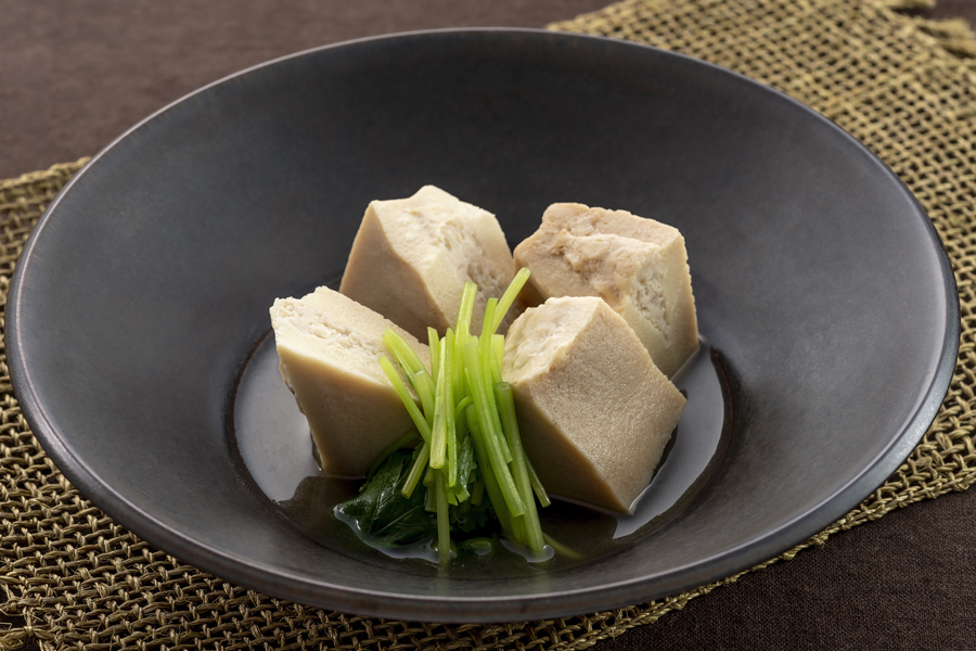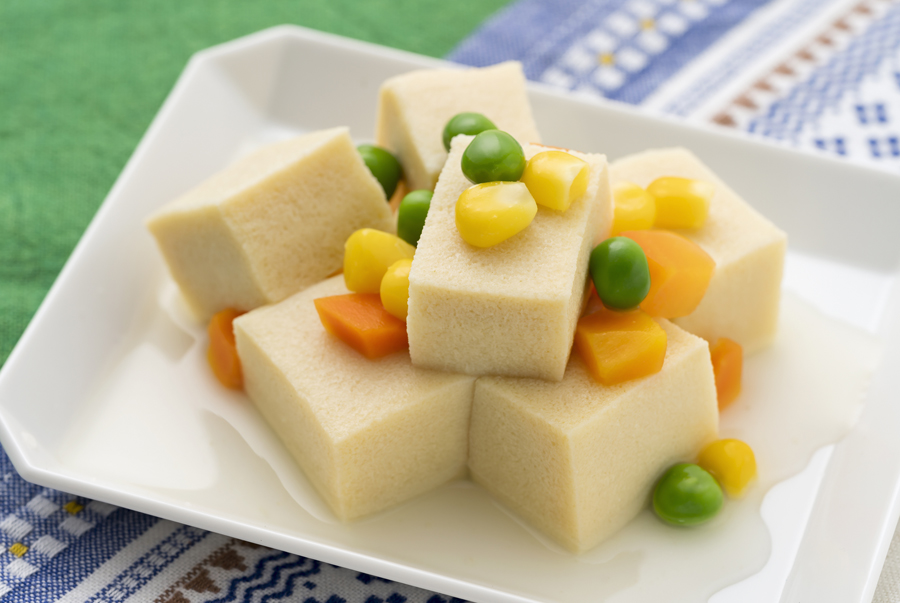 全形(レギュラーサイズ)・ひとくち・細ぎり・キューブなど用途に応じたいろいろなサイズの凍り豆腐や調味料が添付されている凍り豆腐を使った、手軽でおいしいレシピをご紹介します。