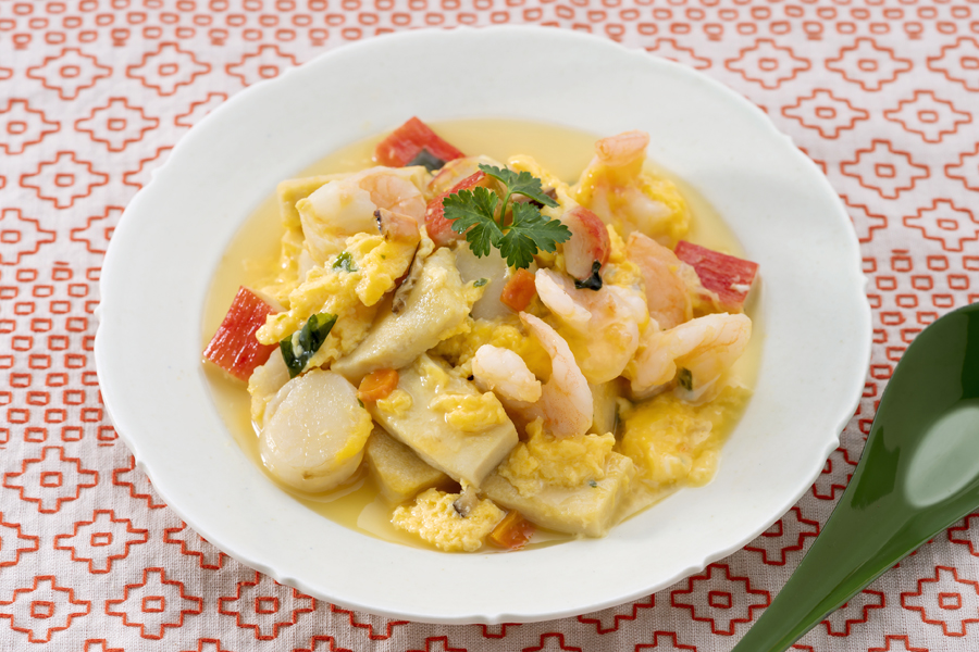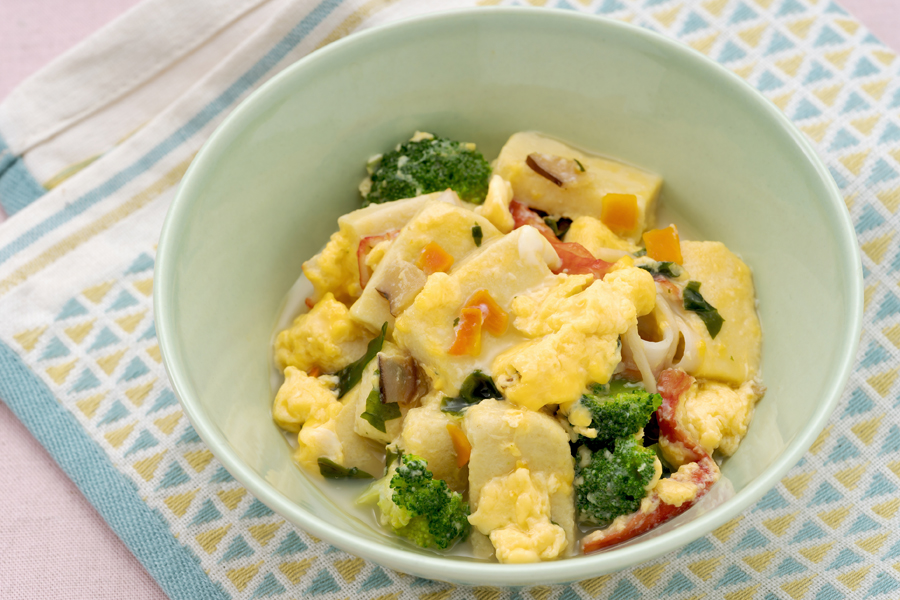 ブロッコリーとカニカマとこうや豆腐の玉子とじ