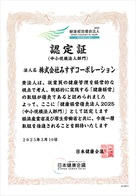 『健康経営優良法人2025』の企業として、今後も、社員の健康力向上のための健康経営に取り組んで参ります。