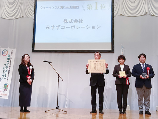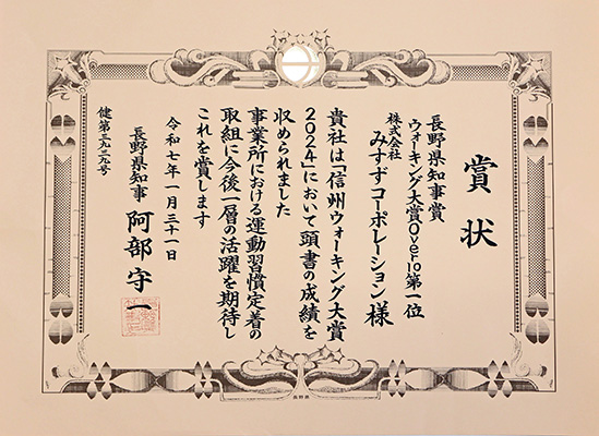 長野県の「健康づくりプロジェクト委員会」が開催した「信州ウォーキング大賞 Over10」の部において第1位を受賞し、長野県知事から表彰いただきました。